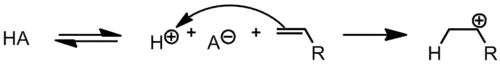 Strong protic acids can be used to form a cationic initiating species. High concentrations of the acid are needed in order to produce sufficient quantities of the cationic species. The counterion (A−) produced must be weakly nucleophilic so as to prevent early termination due to combination with the protonated alkene.[5] Common acids used are phosphoric, sulfuric, fluoro-, and triflic acids. Only low molecular weight polymers are formed with these initiators.[2]