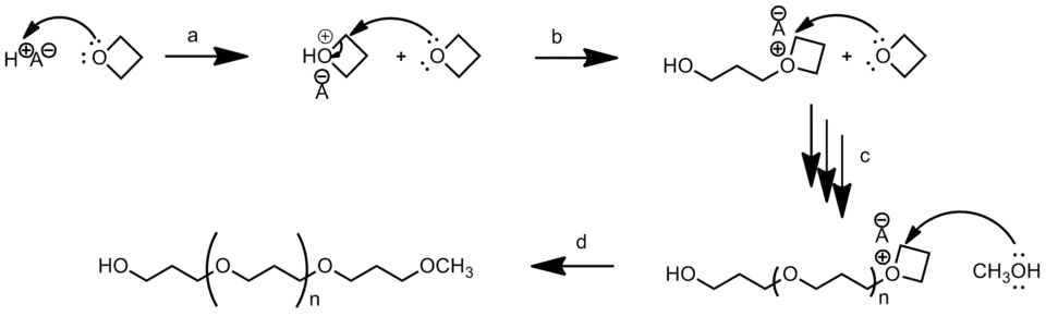Cationic ring-opening polymerization follows the same mechanistic steps of initiation, propagation, and termination. However, in this polymerization reaction, the monomer units are cyclic in comparison to the resulting polymer chains which are linear. The linear polymers produced can have low ceiling temperatures, hence end-capping of the polymer chains is often necessary to prevent depolymerization.[6]