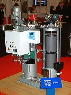 A centrifugal water–oil separator, centrifugal oil–water separator or centrifugal liquid–liquid separator is a device designed to separate oil and water by centrifugation. It generally contains a cylindrical container that rotates inside a larger stationary container. The denser liquid, usually water, accumulates at the periphery of the rotating container and is collected from the side of the device, whereas the less dense liquid, usually oil, accumulates at the rotation axis and is collected from the center.[1]