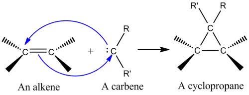 One of the most synthetically important cheletropic reactions is the addition of a singlet carbene to an alkene to make a cyclopropane (see figure at left).[1] A carbene is a neutral molecule containing a divalent carbon with six electrons in its valence shell. Due to this, carbenes are highly reactive electrophiles and generated as reaction intermediates.[9] A singlet carbene contains an empty p orbital and a roughly sp2 hybrid orbital that has two electrons. Singlet carbenes add stereospecifically to alkenes, and alkene stereochemistry is retained in the cyclopropane product.[1] The mechanism for addition of a carbene to an alkene is a concerted [2+1] cycloaddition (see figure). Carbenes derived from chloroform or bromoform can be used to add CX2 to an alkene to give a dihalocyclopropane, while the Simmons–Smith reagent adds CH2.[10]