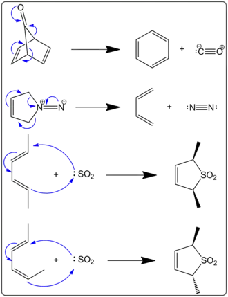 The above are known as cheletropic eliminations because a small, stable molecule is given off in the reaction.[1]