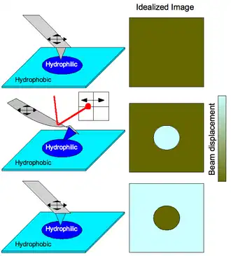 Chemical interactions can also be used to map prepatterned substrates with varying functionalities (see Figure 3). Scanning of a surface having varying hydrophobicity with a tip having no functional groups attached would produce an image with no contrast because the surface is morphologically featureless (simple AFM operation). Functionalizing a tip to be hydrophilic would cause the cantilever to bend when the tip scans across hydrophilic portions of the substrate due to strong tip-substrate interactions. This is detected by laser deflection in a position sensitive detector, thereby producing a chemical profile image of the surface. Generally, a brighter area would correspond to a greater amplitude of deflection, so stronger bonding corresponds to lighter areas of a CFM image map. When the cantilever functionalization is switched such that the tip is bent when encountering hydrophobic areas of the substrate instead, the complementary image is observed.