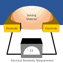 A basic chemiresistor consists of a sensing material that bridges the gap between two electrodes or coats a set of interdigitated electrodes. The resistance between the electrodes can be easily measured. The sensing material has an inherent resistance that can be modulated by the presence or absence of the analyte. During exposure, analytes interact with the sensing material. These interactions cause changes in the resistance reading. In some chemiresistors the resistance changes simply indicate the presence of analyte. In others, the resistance changes are proportional to the amount of analyte present; this allows for the amount of analyte present to be measured.