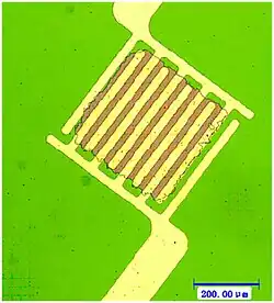 Interdigitated electrodes allow for a greater amount of the film's surface area to be in contact with the electrode. This allows for more electrical connections to be made and increases the overall conductivity of the system.[7] Interdigitated electrodes with finger sizes and finger spacing on the order of microns are difficult to manufacture and require the use of photolithography.[8] Larger features are easier to fabricate and can be manufactured using techniques such as thermal evaporation. Both interdigitated electrode and single-gap systems can be arranged in parallel to allow for the detection of multiple analytes by one device.[11]