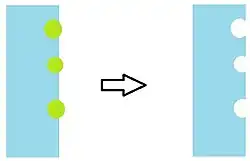 Many different nanoparticles of varying size, structure and composition have been incorporated into chemiresistor sensors.[33][34] The most commonly used are thin films of gold nanoparticles coated with self-assembled monolayers (SAMs) of organic molecules.[35][36][37][38][39] The SAM is critical in defining some of the nanoparticle assembly’s properties. Firstly, the stability of the gold nanoparticles depends upon the integrity of the SAM, which prevents them from sintering together.[40] Secondly, the SAM of organic molecules defines the separation between the nanoparticles, e.g. longer molecules cause the nanoparticles to have a wider average separation.[41] The width of this separation defines the barrier that electrons must tunnel through when a voltage is applied and electric current flows. Thus by defining the average distance between individual nanoparticles the SAM also defines the electrical resistivity of the nanoparticle assembly.[42][43][44] Finally, the SAMs form a matrix around the nanoparticles that chemical species can diffuse into. As new chemical species enter the matrix it changes the inter-particle separation which in turn affects the electrical resistance.[45][46] Analytes diffuse into the SAMs at proportions defined by their partition coefficient and this characterizes the selectivity and sensitivity of the chemiresistor material.[41][47]