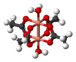 In chemistry, the Chinese lantern structure is a coordination complex where two metal atoms are bridged by four bidentate ligands. This structure type is also known as a paddlewheel complex. Examples include chromium(II) acetate, molybdenum(II) acetate, and rhodium(II) acetate, copper(II) acetate dihydrate. The name is derived from the resemblance between the structure and a Chinese paper lantern. Often additional ligands are bound to the metal centers along the M---M vector. The degree of metal-metal bonding varies according to the d-electron configuration.[1]