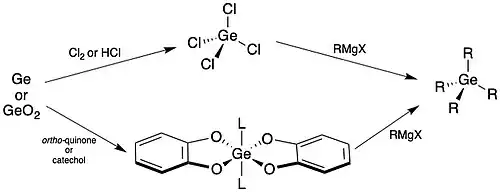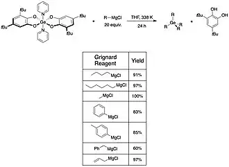 The intermediates prepared by the above method are able to easily undergo substitution reactions with nucleophiles to form tetraorganogermanes, , of which include, , Germane. Germane is a key material in optical and electronic device fabrication.[9] These substitution reactions return the original catechol ligand, making this germanium activation process easily recyclable. A solution of 20 equivalents of an alkyl or aryl Grignard reagent in tetrahydrofuran, combined with bis(catecholate) complex leads to a homogeneous solution of reagents in THF. Refluxing this solution for 24 hours yields the Grignard product organogermane in relatively high yield across multiple reagents. The figure below shows different reagents used by Glavinović et al, showing the efficacy of the substitution reaction.