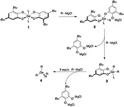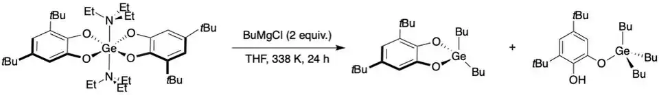 The substitution reaction described above is thought to process via a mechanism in which steric strain of the complex is slowly alleviated over the course of the reaction.[10] The first Grignard reagent substitutes the most sterically hindered oxygen position, where the t-butyl group of the catechol ligand is alpha to the oxygen. The second Grignard reagent substitutes the now uni-dentate catechol-grignard adduct, removing the ligand and resulting in two complete substitutions. Referring to the scheme below, treating intermediate 2 with an additional equivalent of Grignard reagent yields 3 at a faster rate than the rate to make 2, and treatment of 3 with two equivalents of reagent yields 4 at even more quickly. This is starkly different from the substitution reactions of , in which the germanium center becomes more sterically hindered over the course of the reaction as ligand exchange of the carbons and the chlorides progresses, making the substitution more difficult.
