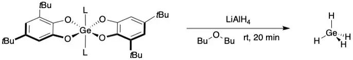 Despite being highly volatile and toxic, germane, , is extremely important in the field of optoelectronics and is a good candidate for vapor deposition to form thin films of germanium.[9] However, germane must be extremely pure to use in such a way, and much research has gone into developing methodologies to prepare and purify germane.[11] Using bis(catecholate) germanium and lithium aluminum hydride () in dibutyl ether with argon as a carrier gas, the substitution reaction yields high purity germane in the Ar carrier gas with no evolution of volitile Ge byproducts. This reaction pathway for production of germane requires no postsynthetic processing or purification, proving this to be more advantageous than current methods.