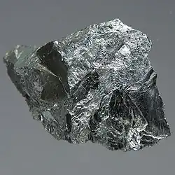 Chromium has a high specular reflection in comparison to other transition metals. In infrared, at 425 μm, chromium has a maximum reflectance of about 72%, reducing to a minimum of 62% at 750 μm before rising again to 90% at 4000 μm.[11] When chromium is used in stainless steel alloys and polished, the specular reflection decreases with the inclusion of additional metals, yet is still high in comparison with other alloys. Between 40% and 60% of the visible spectrum is reflected from polished stainless steel.[11] The explanation on why chromium displays such a high turnout of reflected photon waves in general, especially the 90% in infrared, can be attributed to chromium's magnetic properties.[19] Chromium has unique magnetic properties; it is the only elemental solid that shows antiferromagnetic ordering at room temperature and below. Above 38 °C, its magnetic ordering becomes paramagnetic.[7] The antiferromagnetic properties, which cause the chromium atoms to temporarily ionize and bond with themselves, are present because the body-centric cubic's magnetic properties are disproportionate to the lattice periodicity. This is due to the magnetic moments at the cube's corners and the unequal, but antiparallel, cube centers.[19] From here, the frequency-dependent relative permittivity of chromium, deriving from Maxwell's equations and chromium's antiferromagnetism, leaves chromium with a high infrared and visible light reflectance.[20]