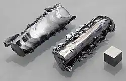 Metallic, reflective crystals of chromium metal and a cube of the same material