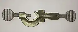 A clamp holder or clamp fastener is a piece of laboratory apparatus that is used to secure laboratory clamps, such as extension-type utility clamps, or other attachments to a retort stand or lab frame.[1] The material can be made up of brass, cast iron, stainless steel, aluminium or nickel-plated zinc.[2]