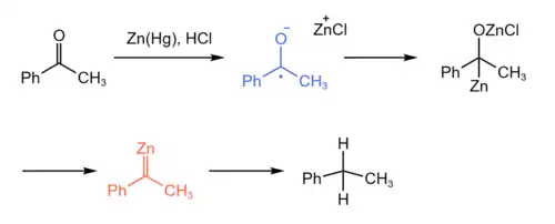 Scheme 2: A mechanism of Clemmensen reduction was proposed in 1975.[7][8] The carbonyl is first converted to radical anion (shown as blue), then to zinc carbenoid (shown as red), and then reduced to alkane.