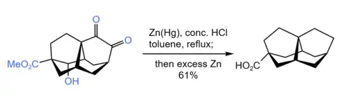 Highly symmetrical hydrocarbon compounds have attracted much interest due to their beautiful structure and potential applications, but the challenges in the synthesis persist. Suzuki et al. synthesized dibarrelane, a type of hydrocarbon compound, using Clemmensen reduction.[12] They hypothesized that the secondary alcohol underwent an SN1 reaction, forming a chloride. Then, an excess amount of zinc reduced the chloride. Importantly, the reaction effectively reduced the two ketones, alcohol, and the methoxycarbonyl group while avoiding any by-products, giving the product in high yield (61%).