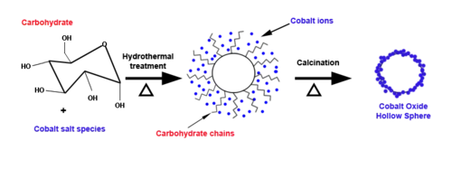 One-pot hydrothermal synthesis of metal oxide hollow spheres starts with carbohydrates and metal salts dissolved in water at 100-200 °C. The reaction produces carbon spheres, with metal ions integrated into the hydrophobic shell. The carbon cores are removed by calcination, leaving hollow metal oxide spheres. Surface area and thickness of the shell can be manipulated by varying the carbohydrate to metal salt concentration, as well as the temperature, pressure, and pH of the reaction medium, and the cations of the starting salts.[8] The completion time for the procedure varies from hours to days.[9]