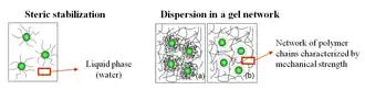 A method called gel network stabilization represents the principal way to produce colloids stable to both aggregation and sedimentation. The method consists in adding to the colloidal suspension a polymer able to form a gel network. Particle settling is hindered by the stiffness of the polymeric matrix where particles are trapped,[26] and the long polymeric chains can provide a steric or electrosteric stabilization to dispersed particles. Examples of such substances are xanthan and guar gum.