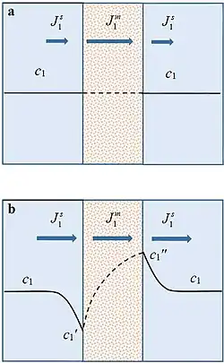 In membrane science and technology, concentration polarization refers to the emergence of concentration gradients at a membrane/solution interface resulted from selective transfer of some species through the membrane under the effect of transmembrane driving forces.[4] Generally, the cause of concentration polarization is the ability of a membrane to transport some species more readily than the other(s) (which is the membrane permselectivity): the retained species are concentrated at the upstream membrane surface while the concentration of transported species decreases. Thus, concentration polarization phenomenon is inherent to all types of membrane separation processes. In the cases of gas separations, pervaporation, membrane distillation, reverse osmosis, nanofiltration, ultrafiltration, and microfiltration separations, the concentration profile has a higher level of solute nearest to the upstream membrane surface compared with the more or less well mixed bulk fluid far from the membrane surface. In the case of dialysis and electrodialysis, the concentrations of selectively transported dissolved species are reduced at the upstream membrane surface compared to the bulk solution. The emergence of concentration gradients is illustrated in Figs. 1a and 1b. Fig. 1a shows the concentration profile near and within a membrane when an external driving force is just applied to an initially equilibrium system. Concentration gradients have not yet formed. If the membrane is selectively permeable to species 1, its flux () within the membrane is higher than that in the solution (). Higher flux in the membrane causes a decrease in the concentration at the upstream membrane surface () and an increase at the downstream surface (), Fig. 1b. Thus, the upstream solution becomes depleted and the downstream solution becomes enriched in regard to species 1. The concentration gradients cause additional diffusion fluxes, which contribute to an increase of the total flux in the solutions and to a decrease of the flux in the membrane. As a result, the system reaches a steady state where . The greater the external force applied, the lower . In electrodialysis, when becomes much lower than the bulk concentration, the resistance of the depleted solution becomes quite elevated. The current density related to this state is known as the limiting current density.[5]