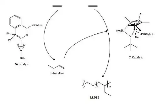 Electrophilic boranes activate the chelated nickel catalyst to oligomerize ethylene into α-butylene. In the same pot a titanium catalyst polymerizes ethylene and the α-olefin to form LLDPE. The degree of branching was found to increase linearly with the increase in concentration of the nickel catalyst.[3][4]