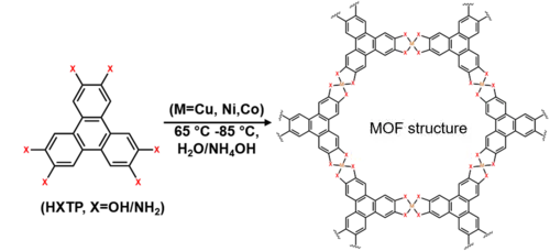 Examples include a series of isoretical catecholate-based MOFs employing hexahudroxytriphenylene (HHTP) as thee organic linker and Ni/Cu/Co as metal nodes. For the hydrothermal synthesis of these MOFs, both organic linker (hexahydroxytriphenylene) and metal ion is dissolved in H2O, aqueous ammonia is added and mixture is heated. Cu3(HHTP) also known as (Cu-CAT-1) showed a conductivity up to 2.1 × 10−1 S cm−1.[17] Another MOF based on hexaaminotriphenylene (HATP) organic linker and Ni metal ion showed an electronic conductivity of 40 S cm−1 when measured by using Van der Pauw method .[18]