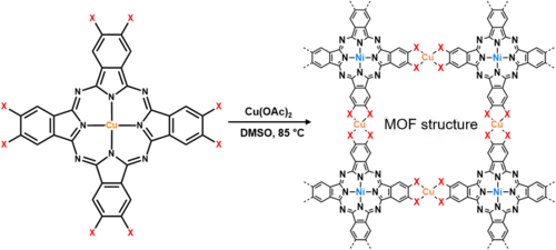 In 2017 Kimizuka reported a phthalocyanine based conductive MOF Cu-CuPc with an intrinsic conductivity in the range of 10−6 S cm−1. For the solvothermal synthesis of MOF, the organic linker Cu-octahydroxy phthalocyanine (CuPc) and metal ion is dissolved in a DMF/H2O mixture at heated at 130 °C for 48 hours.[15] Afterwards, Mirica and co-workers were able to enhance the conductivity to a range of 10−2 S cm−1 by synthesizing a bimetallic phthalocyanine based MOF NiPc-Cu.[16]