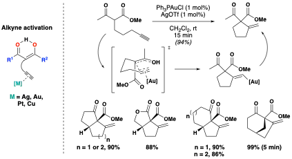 In Conia-ene reactions proceeding via alkyne activation, a suitable late transition metal (Au, Ag, Pt, Pd) coordinates to the alkyne and increases its electrophilicity; thus, the enol tautomer of the carbonyl can attack more readily. Toste et al. pioneered two of the first examples of alkyne activation in 2004.[8] Using a cationic Au(I) complex, the authors formed a wide variety of cyclized products from linear β-ketoester starting materials. Notably, the reactions are run under mild conditions and give high diastereoselectivity. Moreover, by shortening the alkyne tether from three carbons to two, substituted cyclopentenes can also be accessed.[9]
