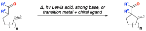 In the decades after the discovery of the Conia-ene reaction, several improvements allowed for milder reaction conditions and greater control of product stereo- and regiochemistry. For example, the carbonyl component, formerly a ketone or aldehyde, became a substituted β-ketoester or malonate ester. Such carbonyls enolize much more readily, yielding better access to the desired enol tautomer.[4] Additionally, the alkene component was replaced with an alkyne, which not only gave better cyclization in accordance with Baldwin’s rules, but also furnished a product containing an alkene that served as a useful handle for further transformations.[5] Finally, recent efforts have featured metal-mediated and metal-catalyzed Conia-ene reactions that can be rendered asymmetric using chiral ligands.[6]