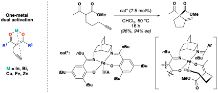 To effect dual activation by a single metal, the same metal species that activates the enolate also interacts with the alkyne. Though the precise mechanisms are poorly understood and likely vary from case to case, metals such as In, Zn, Fe, and Cu are proposed to operate via this mode.[6] One reaction system thought to proceed via one-metal dual activation is that developed by Shaw et al. in 2014. Using a catalytic Fe(III)-(Salen) complex, Shaw and coworkers were able to access chiral cyclopentanes from an array of alkynyl-tethered β-ketoesters and analogs thereof.[11] The reaction tolerated a wide range of ketones (phenyl, homoallyl, cyclopropyl, 2-furyl, etc.), esters (ethyl, tert-butyl, etc.), and ester analogs (nitro, phosphono, cyano, sulfonyl, etc.).