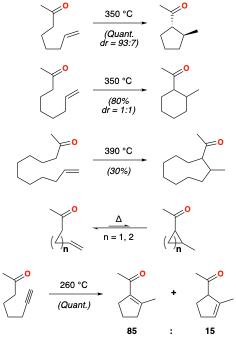 The same conditions were found to give six- and nine-membered rings with the appropriate substrates, although with lower yields and diastereoselectivity. In the case of γ,δ- and δ,ε-unsaturated ketones, equilibrium favored the linear product over the cyclopropane or cyclobutane. Alkynyl ketones were also found to cyclize under thermal conditions, giving a mixture of the conjugated and skipped cyclic enones.