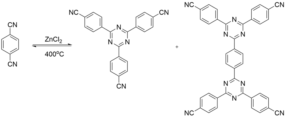 Cyano cyclotrimerization reactions occur under ionothermal conditions, where CMPs are obtained in molten zinc chloride at high temperatures.[13] Building units can produce C3N3 rings. These rings are then linked to a triangular plane as a secondary building unit. Cyclotrimerization is often used to link tetrahedral monomers to create CMPs. CMPs that are synthesized via cyano cyclotrimerization exhibit narrow micropore size distribution, high enthalpies of H2 adsorption and fast selective gas adsorption.[14]