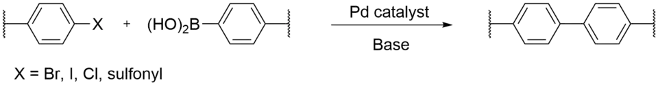 Since 1979, Suzuki coupling has been an efficient method for aryl-aryl bond formation.[3] The reaction conditions of Suzuki coupling for the formation of a biphenyl repeat unit for CMPs include the palladium catalyzed cross-coupling of an organo-boron reagent with an organic halide or sulfonate in the presence of some base. An advantage of using this method to synthesize CMPs is that reaction conditions are mild, there is commercial availability of organo-boron reagents, and the reaction has high functional group tolerance. This method is best used for large scale synthesis of CMPs.[4] A drawback to Suzuki coupling is the reaction being oxygen sensitive, often leading to side products, as well as the reaction needing to be degassed.[2]