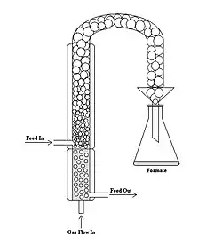 Continuous foam separation is one of two major modes of foam separation with the other being batch foam separation. The difference between the two modes is that in continuous mode, surfactant solution is continuously fed through a feed into the foam column and a solution, extracted of surfactant, is also continuously exiting the bottom of the apparatus. The figure to the right shows a diagram of a basic continuous foam separator. The process is stationary (or in steady state) as long as the volume of liquid is constant as a function of time. As long as the process is in steady state, the liquid will not overflow into the foaming column. Depending on the design of the foam separator, the location of the feed flowing in can vary from atop of the liquid solution to the top of the foam column.[17]