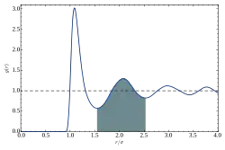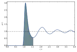 The first coordination number can be defined using the radial distribution function g(r):[20][21] where r0 is the rightmost position starting from r = 0 whereon g(r) is approximately zero, r1 is the first minimum. Therefore, it is the area under the first peak of g(r).