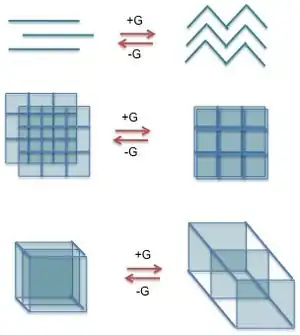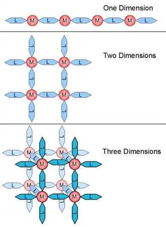 Coordination polymers can be classified in a number of ways according to their structure and composition. One important classification is referred to as dimensionality. A structure can be determined to be one-, two- or three-dimensional, depending on the number of directions in space the array extends in. A one-dimensional structure extends in a straight line (along the x axis); a two-dimensional structure extends in a plane (two directions, x and y axes); and a three-dimensional structure extends in all three directions (x, y, and z axes).[4] This is depicted in Figure 1.