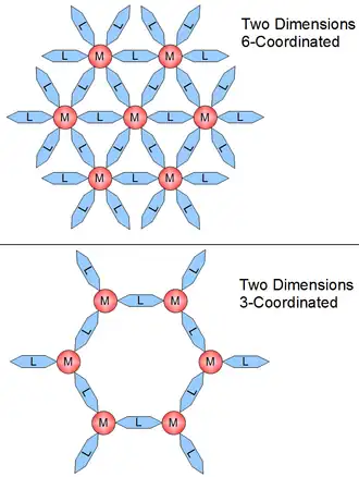 The structure and dimensionality of the coordination polymer are determined by the linkers and the coordination geometry of the metal center. Coordination numbers are most often between 2 and 10.[6] Examples of various coordination numbers are shown in planar geometry in Figure 2. In Figure 1 the 1D structure is 2-coordinated, the planar is 4-coordinated, and the 3D is 6-coordinated.