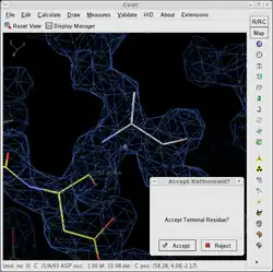 The program Coot (Crystallographic Object-Oriented Toolkit)[2][3] is used to display and manipulate atomic models of macromolecules, typically of proteins or nucleic acids, using 3D computer graphics. It is primarily focused on building and validation of atomic models into three-dimensional electron density maps obtained by X-ray crystallography methods, although it has also been applied to data from electron microscopy.