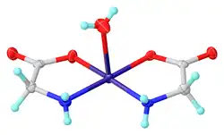 Copper(II) glycinate (IUPAC suggested name: bis(glycinato)copper(II)) refers to the coordination complex of copper(II) with two equivalents of glycinate, with the formula [Cu(glycinate)2(H2O)x] where x = 1 (monohydrate) or 0 (anhydrous form). The complex was first reported in 1841, and its chemistry has been revisited many times, particularly in relation to the isomerisation reaction between the cis and trans forms which was first reported in 1890.[2][3]