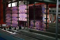 The anodes can be either simple copper slabs or titanium or steel baskets filled with copper nuggets or balls.[6] The anodes may be placed in anode bags, which are typically made of polypropylene or another fabric and are used to contain insoluble particles that flake off the anode and prevent them from contaminating the plating bath.[2][7]