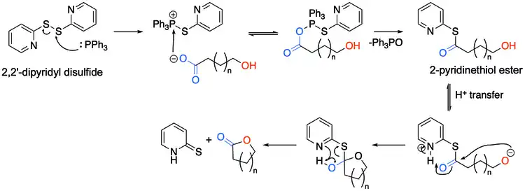 The hydroxy acid first reacts with the 2,2'-Dipyridyldisulfide to form the corresponding 2-pyridinethiol ester, and after a proton transfer, the alkoxide attacks the carbonyl carbon, forming a tetrahedral transition state, before resolving back to the desired lactone and 2-pyridinethione.[4][5]