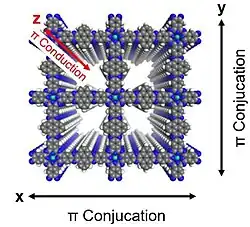 Integration of SBUs into a covalent framework results in the synergistic emergence of conductivities much greater than the monomeric values. The nature of the SBUs can improve conductivity. Through the use of highly conjugated linkers throughout the COF scaffold, the material can be engineered to be fully conjugated, enabling high charge carrier density as well as through- and in-plane charge transport. For instance, Mirica and coworkers synthesized a COF material (NiPc-Pyr COF) from nickel phthalocyanine (NiPc) and pyrene organic linkers that had a conductivity of 2.51 x 10−3 S/m, which was several orders of magnitude larger than the undoped molecular NiPc, 10−11 S/m.[34] A similar COF structure made by Jiang and coworkers, CoPc-Pyr COF, exhibited a conductivity of 3.69 x 10−3 S/m.[35] In both previously mentioned COFs, the 2D lattice allows for full π-conjugation in the x and y directions as well as π-conduction along the z axis due to the fully conjugated, aromatic scaffold and π-π stacking, respectively.[34][35] Emergent electrical conductivity in COF structures is especially important for applications such as catalysis and energy storage where quick and efficient charge transport is required for optimal performance.