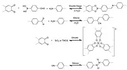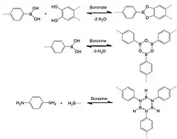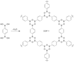 The most popular COF synthesis route is a boron condensation reaction which is a molecular dehydration reaction between boronic acids. In case of COF-1, three boronic acid molecules converge to form a planar six-membered B3O3 (boroxine) ring with the elimination of three water molecules.[5]