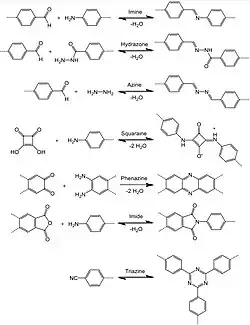 The imine condensation reaction which eliminates water (exemplified by reacting aniline with benzaldehyde using an acid catalyst) can be used as a synthetic route to reach a new class of COFs. The 3D COF called COF-300[23] and the 2D COF named TpOMe-DAQ[24] are good examples of this chemistry. When 1,3,5-triformylphloroglucinol (TFP) is used as one of the SBUs, two complementary tautomerizations occur (an enol to keto and an imine to enamine) which result in a β-ketoenamine moiety[25] as depicted in the DAAQ-TFP[26] framework. Both DAAQ-TFP and TpOMe-DAQ COFs are stable in acidic aqueous conditions and contain the redox active linker 2,6-diaminoanthroquinone which enables these materials to reversibly store and release electrons within a characteristic potential window.[24][26] Consequently, both of these COFs have been investigated as electrode materials for potential use in supercapacitors.[24][26]