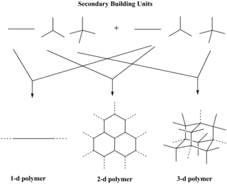 Reticular synthesis enables facile bottom-up synthesis of the framework materials to introduce precise perturbations in chemical composition, resulting in the highly controlled tunability of framework properties.[4][10][11] Through a bottom-up approach, a material is built from atomic or molecular components synthetically as opposed to a top-down approach, which forms a material from the bulk through approaches such as exfoliation, lithography, or other varieties of post-synthetic modification.[3][12] The bottom-up approach is especially advantageous with respect to materials such as COFs because the synthetic methods are designed to directly result in an extended, highly crosslinked framework that can be tuned with exceptional control at the nanoscale level.[3][13][14] Geometrical and dimensional principles govern the framework's resulting topology as the SBUs combine to form predetermined structures.[15][16] This level of synthetic control has also been termed "molecular engineering", abiding by the concept termed by Arthur R. von Hippel in 1956.[17]