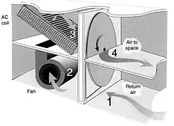 The Cromer cycle is primarily used in air conditioning and drying applications. The cold surface portion of the cycle is most often a result of a reversed Carnot or refrigeration cycle. For the Cromer cycle to operate, a desiccant must be exposed to two air streams, one with higher humidity from a cold surface, and one with lower humidity to dry it. This is most easily accomplished by moving the desiccant. Any cycling mechanism can be used, such as pumping a liquid desiccant, however an easy mechanical application is a rotating wheel, loaded with desiccant, through which the different air streams pass. This is shown in Figure 1 where a desiccant wheel has been applied to a standard air conditioning set-up.