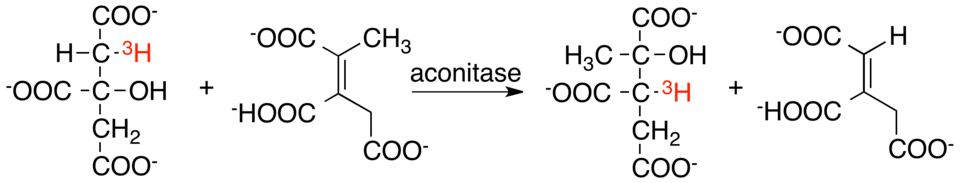 One such isotope scrambling experiment was the reaction of [2R-3H]citrate with aconitase in the presence of 2-methyl-cis-aconitate. This reaction produced both unlabeled cis-aconitate and 2-methyl-[3-3H]isocitrate. The ability of the reaction to produce intermolecular transfer of tritium at this position indicates that the proton removed from citrate does not exchange with solvent. A similar experiment reacting [2-18OH]isocitrate with aconitase failed to produce isotopically labeled citrate, demonstrating that the hydroxyl group, unlike the removed proton, exchanges with solvent every turnover.[21][22]