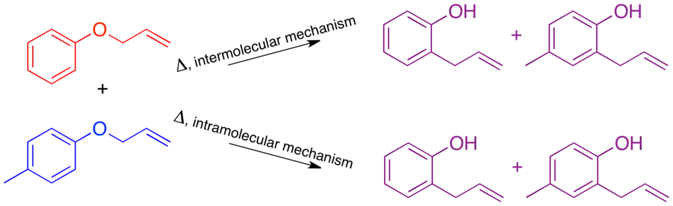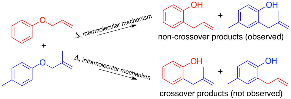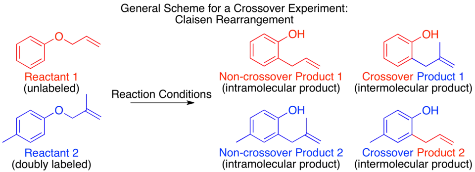 The mechanism of the thermal Claisen rearrangement has been studied by crossover experiment and serves as an excellent example of how to apply this technique.[9] Before the mechanism was determined, it was proposed that the reaction could proceed via an intermolecular or intramolecular route.[1]