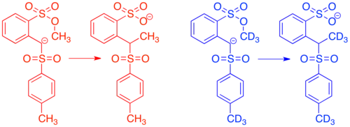 In practice, crossover experiments aim to use the least change possible between the usual conditions of the reaction being studied and the conditions of the crossover experiment. This principle favors isotopic labeling, since changing the isotope of one atom in a molecule is the smallest change that can be both easily enacted and traced in the reaction. If the isotope is placed in the molecule at a position directly involved in the mechanism of the reaction, a kinetic isotope effect is expected. This can be used to study aspects of the mechanism independently or alongside a crossover experiment.[1][2][8] The kinetic isotope effect is a change in the rate of reaction based on the change in isotope, not a change in the mechanism of the reaction itself, so isotopic labeling generally satisfies the requirements for a valid crossover experiment. In crossover experiments that do not use isotopic labeling, addition or subtraction of a methyl substituent at a position not involved in any proposed mechanism for the reaction is typically expected to give a valid crossover experiment.[1]