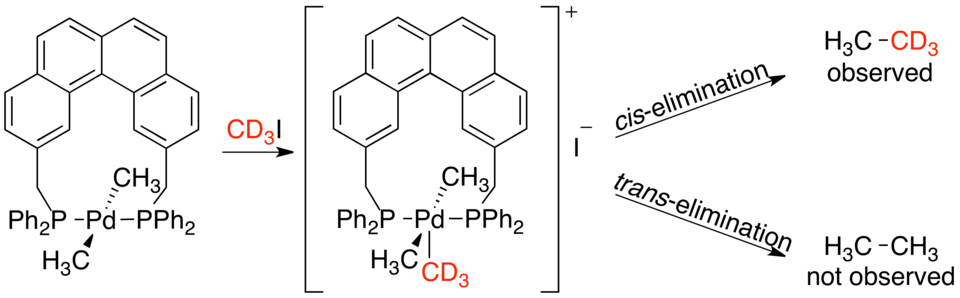 Unlike the two cis-confirmation complexes, Pd(transphos)(CH3)2 did not undergo reductive elimination even when heated to 100 °C. However, addition of methyl iodide to Pd(transphos)(CH3)2 immediately produced ethane. To determine whether or not this reductive elimination was also constrained to only adjacent ligands, an isotope labeling experiment was carried out. The only product was the deuterium-labeled product of cis-elimination. This led to the final conclusion that only ligands adjacent to each other on the metal complex are capable of reductively eliminating.[4][19]