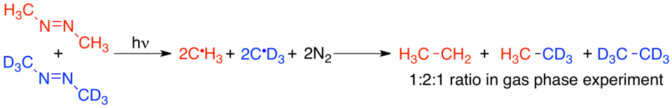 The effect of the solvent cage on crossover experiments is not a purely theoretical concept. One of the first pieces of experimental evidence for the existence of the solvent cage was the observation of the solvent cage effect on a crossover experiment. Since radical recombinations occur on very short timescales compared to non-radical reactions, the solvent cage effect is particularly relevant to radical chemistry.[5] Lyons and Levy were the first to demonstrate the effect of the solvent cage on a radical crossover experiment. When protio- and deutero-azomethane are combined and irradiated in the gas phase, the result is a statistical mixture of the expected non-crossover and crossover radical recombination products, C2H6, CH3CD3, and C2D6, as 1:2:1.[12]