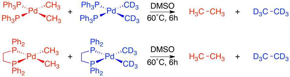 The complexes with cis-methyl groups were already known to undergo reductive elimination to form ethane. A crossover experiment was performed on both Pd(dppe)(CH3)2 and Pd(PPh3)2(CH3)2. In both cases no crossover products were observed, proving the intramolecular nature of reductive elimination.[19]