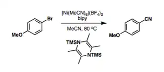 - ↑ Ueda, Yohei (2019). "Nickel-catalyzed cyanation of aryl halides and triflates using acetonitrile via C–CN bond cleavage assisted by 1,4-bis(trimethylsilyl)-2,3,5,6-tetramethyl-1,4-dihydropyrazine". Chemical Science. 10 (4): 994–999. doi:10.1039/c8sc04437f. PMC 6349056. PMID 30774893.